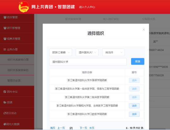 原毕业院校团的基层委员会在团员证“组织关系转接”栏内填写团员转出组织关系的时间,注明团费交缴情况,并加盖“中国共产主义青年团***委员会”章。同时登录“智慧团建”系统,点击业务办理,将团组织关系转入兔子先生 拟录取学院所在团委(创新创业教育学院转入“机关团总支”,台州医院拟录取考生转入“共青团浙江省台州医院委员会”,卓越中心拟录取考生转入“眼视光学院、生物医学工程学院团委”),具体为“选择组织”里依次选择“团浙江省委”,“兔子先生 ”(或“台州医院”),“浙江省兔子先生 XX学院团委”(“机关团总支”或“浙江省台州医院委会”)。