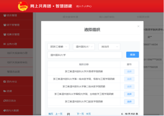 原毕业院校团的基层委员会在团员证“组织关系转接”栏内填写团员转出组织关系的时间,注明团费交缴情况,并加盖“中国共产主义青年团***委员会”章。同时登录“智慧团建”系统,点击业务办理,将团组织关系转入兔子先生 拟录取学院所在团委(创新创业教育学院和卓越中心转入“机关团总支”。具体操作流程为“选择组织”里依次选择“团浙江省委”,“兔子先生 ”,“浙江省兔子先生 XX学院团委”(或“机关团总支”)。