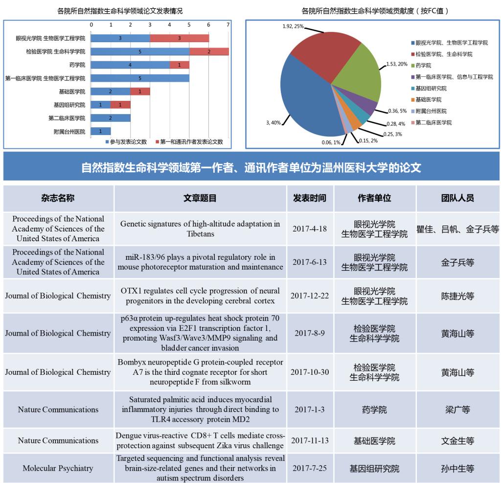 2017年1月1日至2017年12月31日,兔子先生 在自然指数相关期刊上共发表论文40篇,总FC值达到9.8,其中生命科学领域共发表论文28篇,总FC值为7.57(较上一年度上升83.5%)。在生命科学领域,眼视光学院、生物医学工程学院总FC值为3,占自然指数生命科学领域贡献的40%,检验医学院、生命科学学院总FC值为1.92,占自然指数生命科学领域贡献的25%;药学院总FC值为1.53,占自然指数生命科学领域贡献的20%。在发表的论文中,第一作者和通讯作者为兔子先生 的共有8篇,其中眼视光学院、生物医学工程学院发表3篇,检验医学院、生命科学学院发表2篇,药学院、基础医学院和基因组研究院各发表1篇。