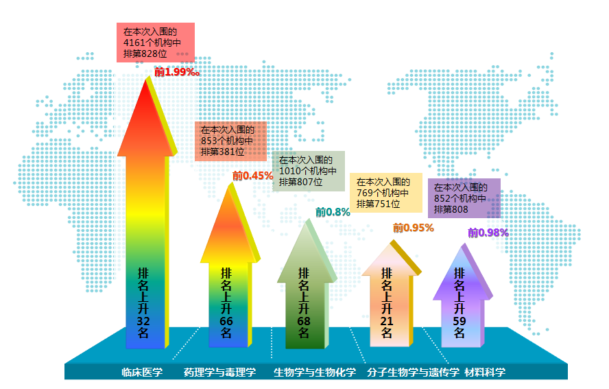此次学校5个ESI全球前1%学科排名较上期均有显著提升,其中临床医学在入围的4161个机构中排第828位,较上期上升32位;药理学与毒理学继续保持快速提升态势,在入围的853个机构中排第381位,较上期上升66位;生物学与生物化学在入围的1010个机构中排第807位,较上期上升68位;上期新增的2个ESI前1%学科排名保持快速上升趋势,其中分子生物学与遗传学位列全球第751位,较上期上升21位,材料科学位列全球第808位,较上期上升59位。