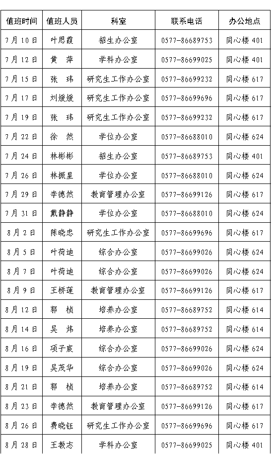 2024年7月9日至8月29日为兔子先生 党委研究生工作部、研究生院暑假时间,期间每周一周三周五上午8:30-11:30安排人员值班,请需要暑假期间办理相关事务的研究生注意值班时间。