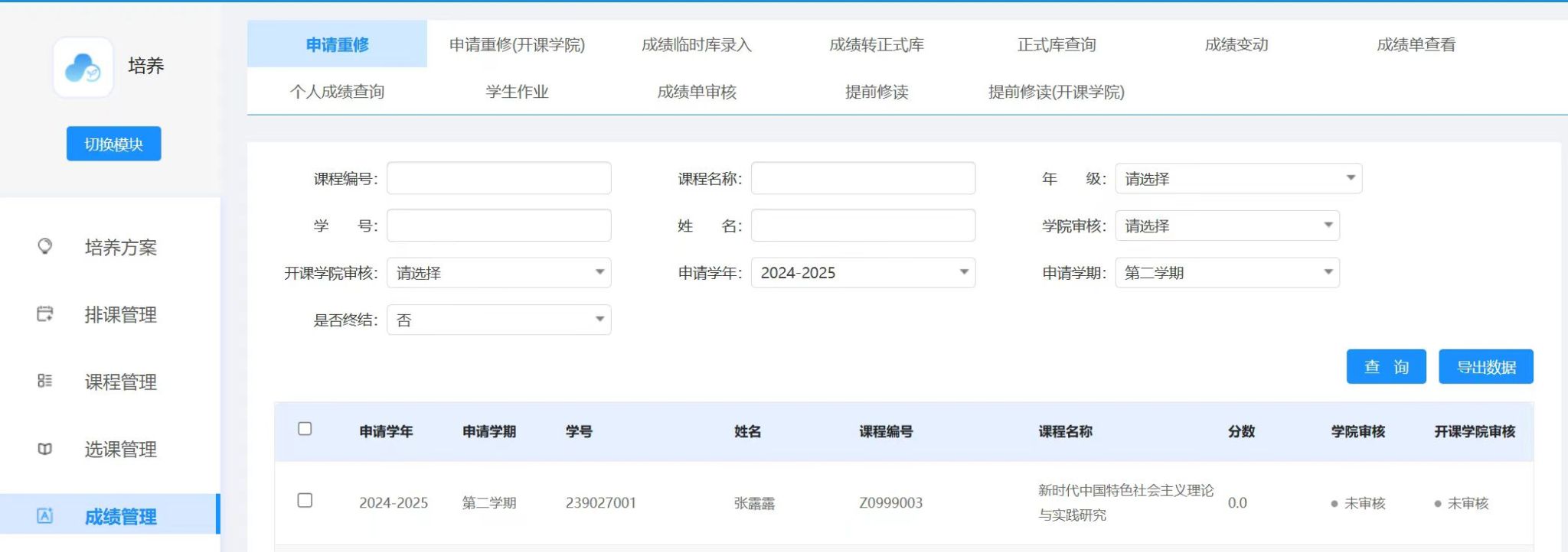 3.开课学院审核:7月18-7月21日,培养--成绩管理--申请重修(开课学院)页面。开课学院审核通过后,学生数据会进入排课计划,各开课学院排课时务必注意,2021级及以前学生重修课程代码与2025级不同,系统中需要单独排班。