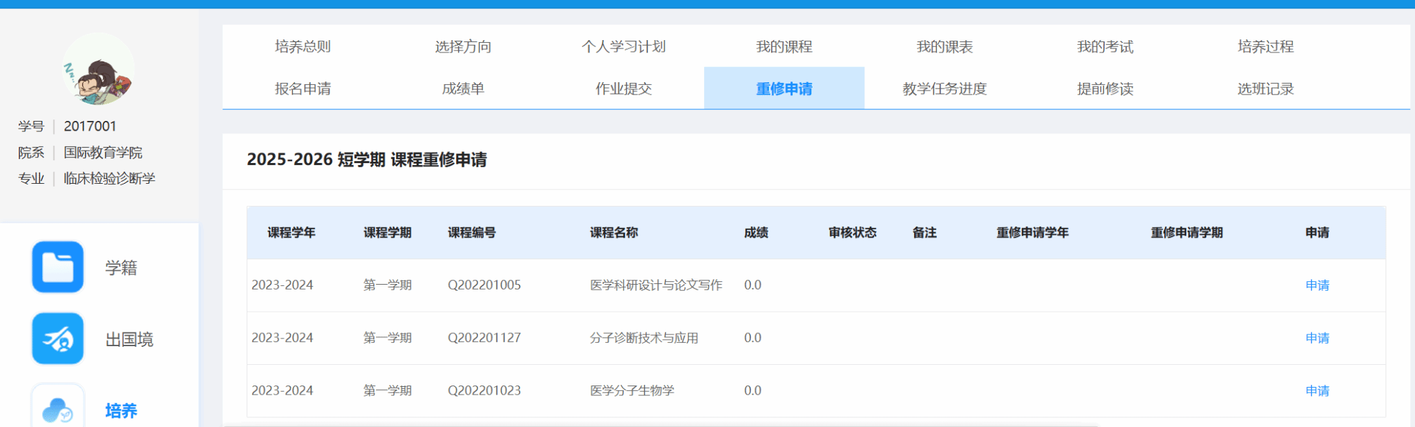 2. 学生所在学院审核:7月18-7月21日,培养--成绩管理--申请重修页面,查看学生提交的申请,注意:暑假期间重修课程仅限上表课程。