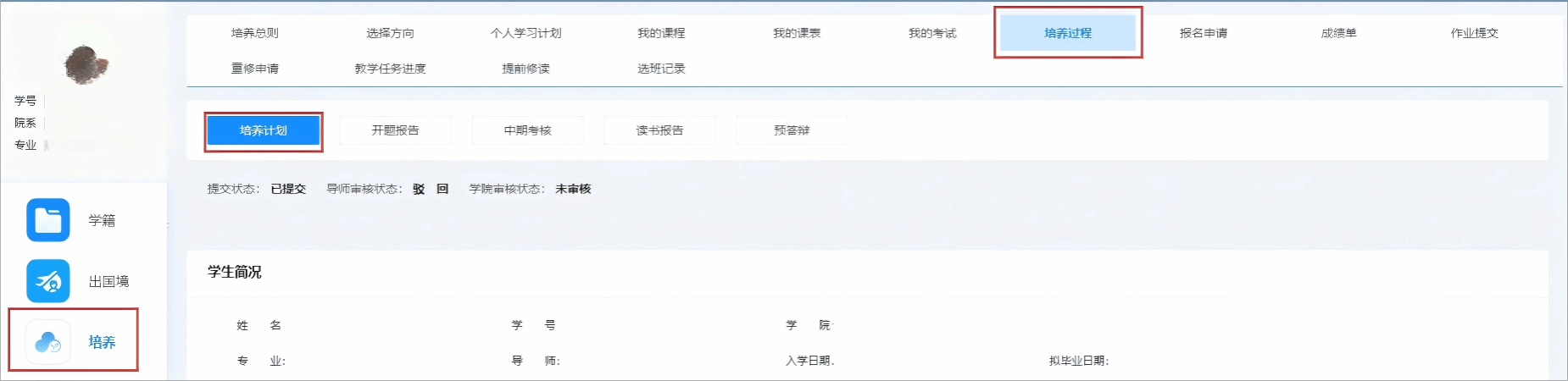 (二)导师审核:完成的培养计划需提交导师审核,经导师同意后方可打印成书面版本上交学院。导师登录系统后,进入学生管理——过程管理——培养计划,可查询学生填写的培养方案并进行审核,导师也可驳回学生的培养计划,经学生修改后再次提交审核,操作办法详见附件1。