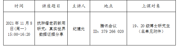因疫情影响,原定于11月8日(周一)下午在温医大附一院学术报告厅举行的《医学科研设计与方法》课程改为线上课程,请参加课程的同学提前十五分钟输入会议ID进入腾讯会议,具体安排如下: