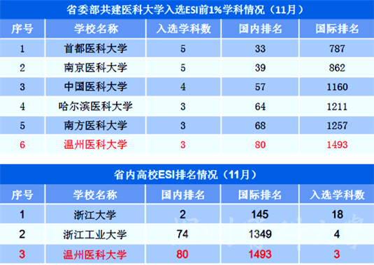 据统计,本期排名国内共有9所省委部共建医科大学进入ESI中国大学综合排名百强,浙江省共有4所高校进入ESI中国大学综合排名百强。