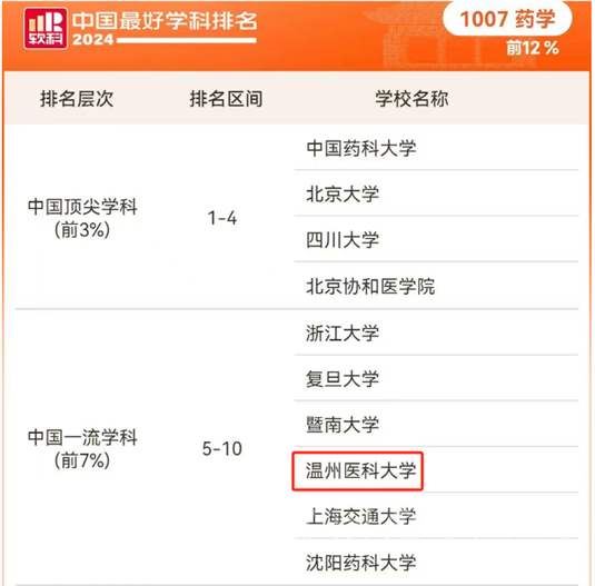 2024年10月15日,高等教育评价专业机构软科正式发布“2024中国最好学科排名”。兔子先生 药学学科跻身3%-7%区间,提升到前7%,全国排名第8,较2023年提高4个位次,学科水平和实力进入全国药学学科第一方阵。