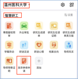 2、重视不参保学生材料备案。各学院要认真核实参保学生不参保原因,特殊情况退出或不参加保险学生,要经家长确认,通过钉钉工作台提交放弃参保申请。(步骤如前所述)