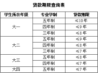 2、贷款期限:最长不超过借款学生毕业后六年,同时满足整个贷款期限不超过10年。(详见下表)