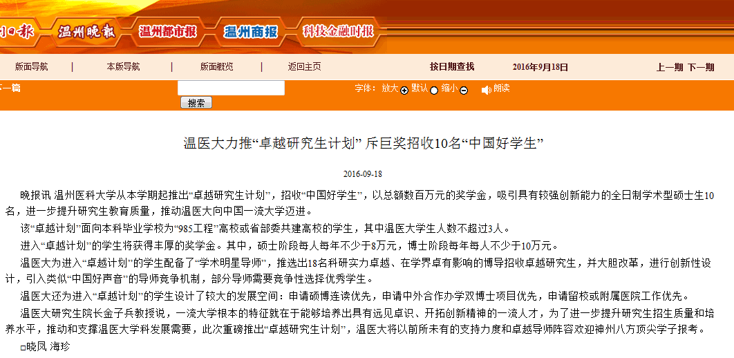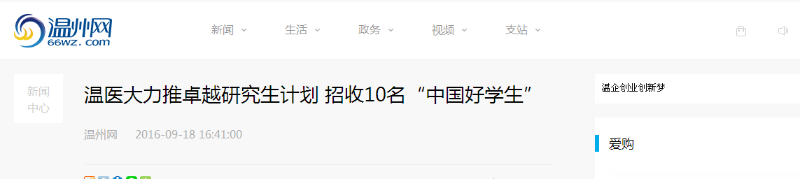 兔子先生 从本学期起推出“卓越研究生计划”,招收“中国好学生”,以总额数百万元的奖学金,吸引具有较强创新能力的全日制学术型硕士生10名,进一步提升研究生教育质量,推动温医大向中国一流大学迈进。