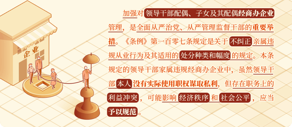 《条例》规定的“违反经商办企业禁业规定”,主要衔接的是2022年中央办公厅印发的《领导干部配偶、子女及其配偶经商办企业管理规定》。《规定》明确,领导干部配偶、子女及其配偶经商办企业管理的适用对象,主要是党政机关、群团组织、企事业单位厅局级及相当职务层次以上领导干部;经商办企业情形,主要是投资开办企业、担任私营企业或外资企业等高级职务、私募股权基金投资及从业、从事有偿社会中介和法律服务等行为。《规定》对不同层级、不同类别领导干部配偶、子女及其配偶经商办企业分别提出了禁业要求,领导干部职务层次越高要求越严,综合部门严于其他部门。实践中,各地区各单位根据本地区本单位实际,细化完善了领导干部配偶、子女及其配偶经商办企业禁业范围。领导干部要按照党中央及本地区本单位的相关规定,加强对家属的教育和约束,做廉洁治家的模范。